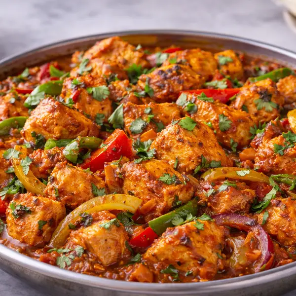 A stir-fried dish with lightly braised onions, garlic, ginger, tomatoes and fresh green chillies.