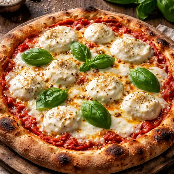 Classic Tomato base and Mozzerella with Mushrooms. Mixed Peppers. Goats Cheese, Cherry Tomatoes & Pesto.